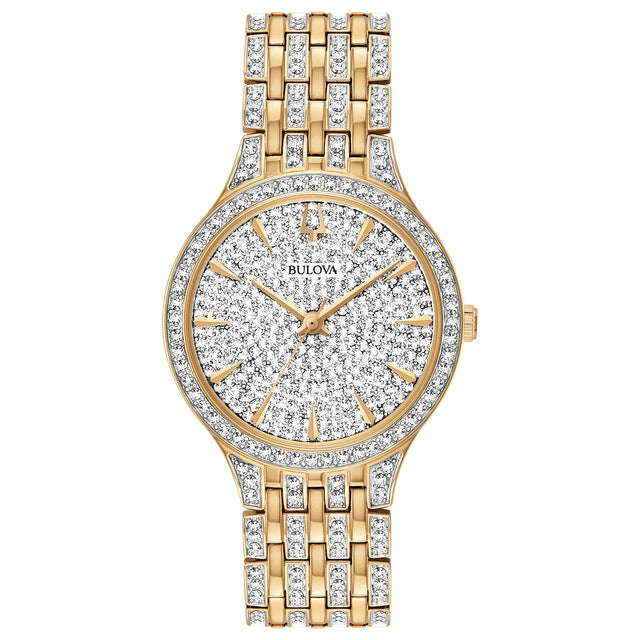 Reloj Bulova para mujer de la colección Phantom, con un diseño delgado y elegante totalmente adornado con 440 cristales Swarovski. Su construcción bicolor en acero inoxidable y la esfera pavé transparente lo convierten en una pieza deslumbrante y sofisticada.