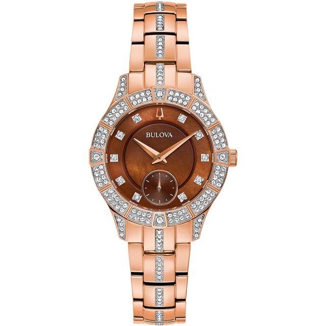 Elegancia absoluta con el Bulova 98L284 de la colección Crystal. Su diseño en acabado oro rosa resalta una exquisita carátula de madre perla color chocolate, decorada con 174 cristales montados individualmente en caja, brazalete y carátula. Un reloj femenino, lujoso y perfecto para ocasiones especiales.