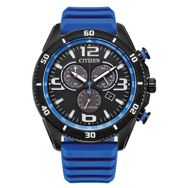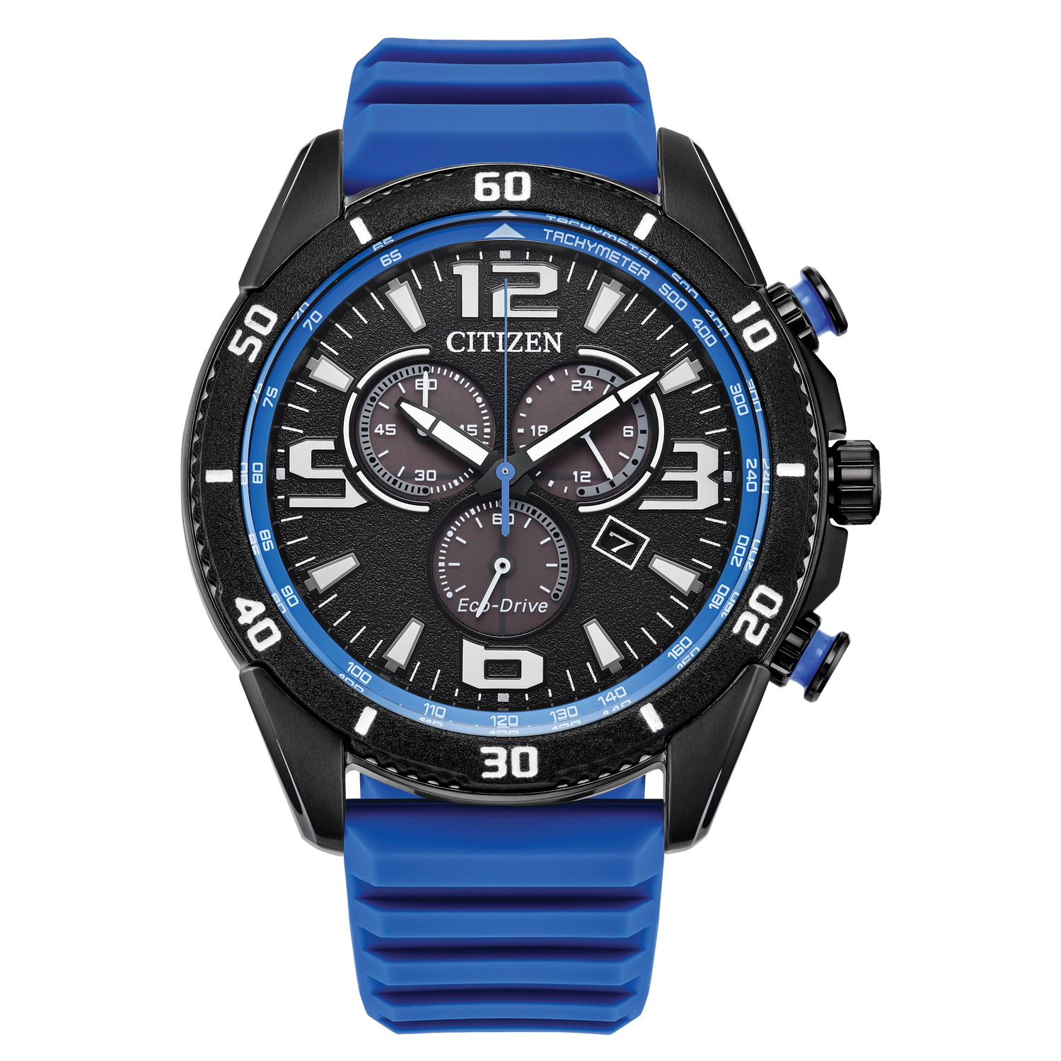 Reloj Citizen Brycen para hombre con caja de acero inoxidable negro de 44.8 mm, correa de silicón azul y esfera negra con funciones de cronógrafo, alimentado por tecnología Eco-Drive.