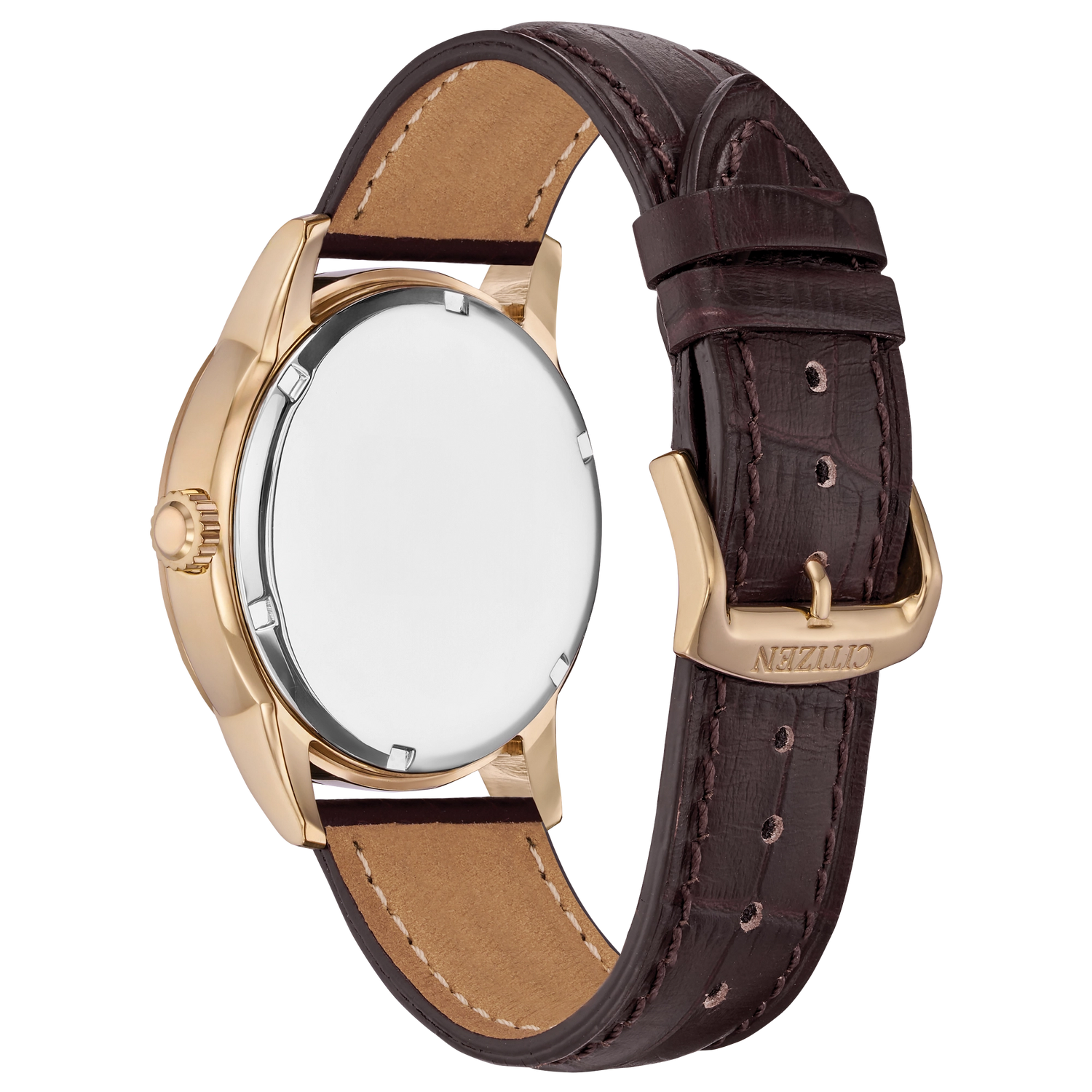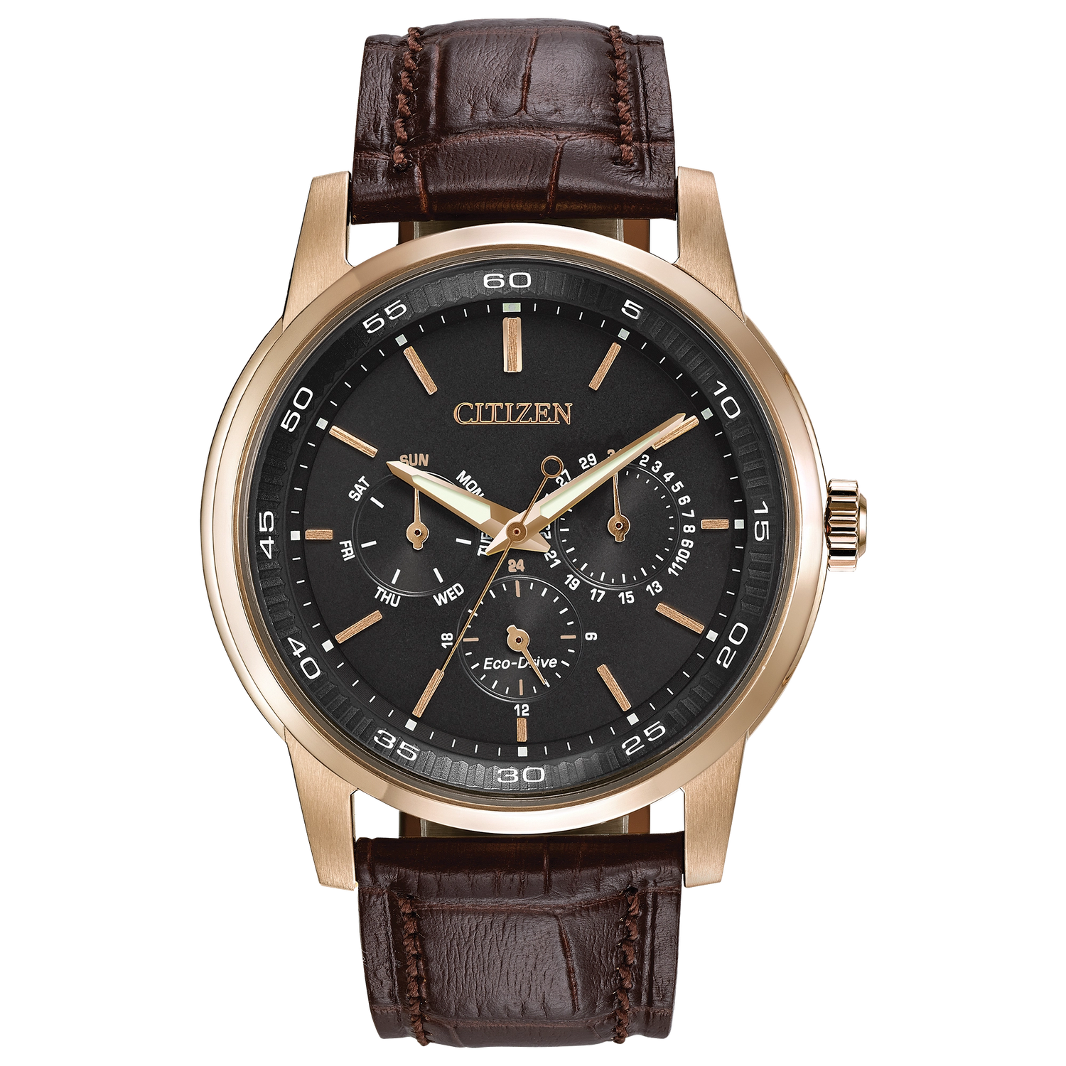 El Citizen BU2013-08E combina estilo clásico con detalles modernos mediante su carátula negra multifunción, acentos en oro rosa y correa de cuero. Su tecnología Eco-Drive y resistencia al agua de 100 metros lo convierten en un reloj funcional, elegante y listo para el uso diario.