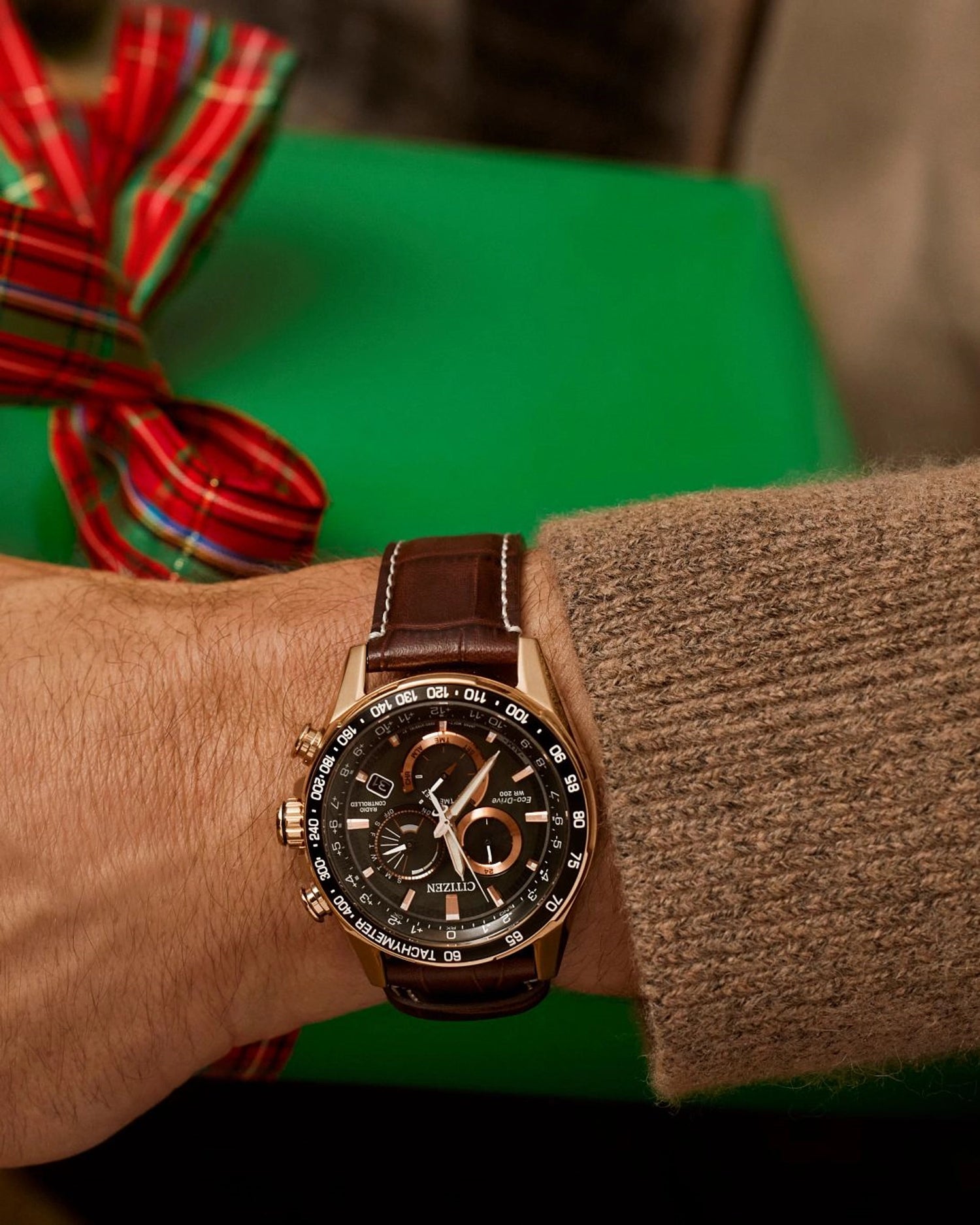 Elegante reloj con caja de acero inoxidable en tono oro rosa, correa de piel café, esfera verde y tecnología Eco-Drive que se alimenta de la luz.