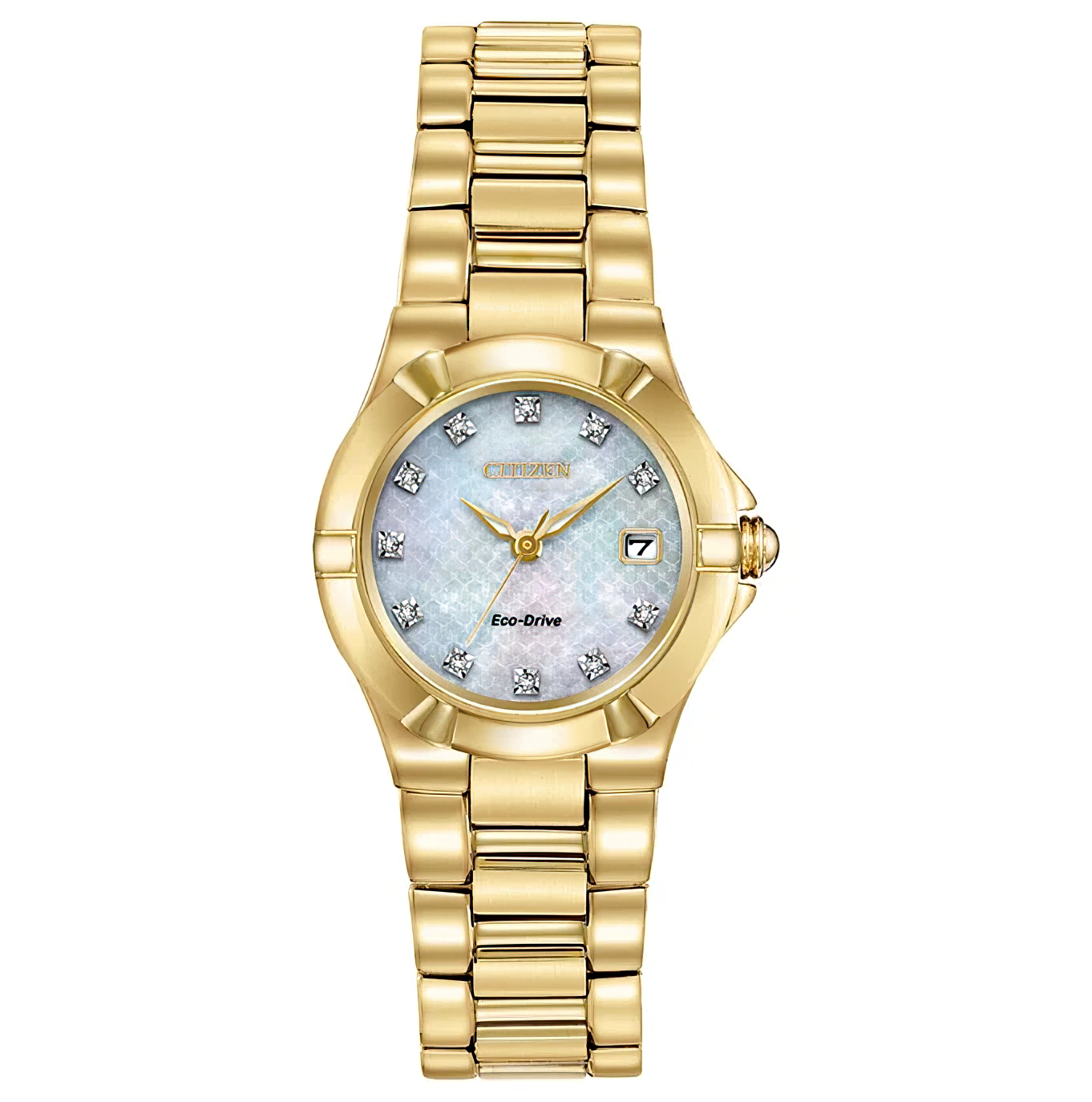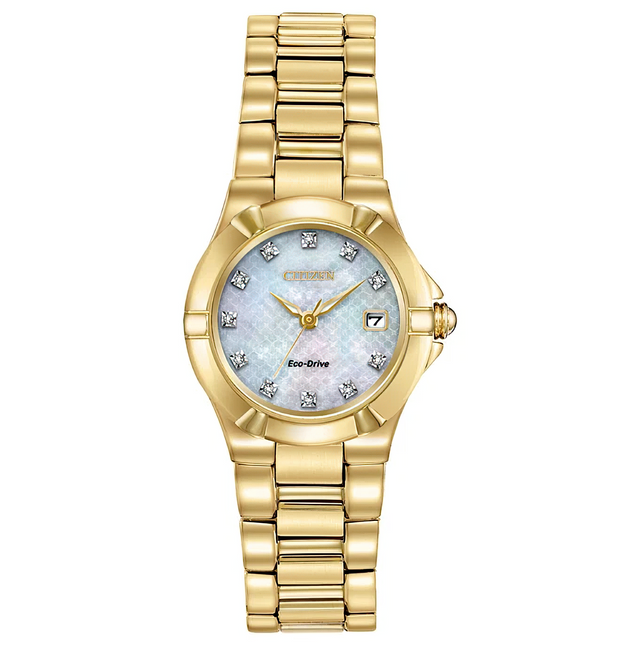 Elegante y brillante, el Citizen EW1532-61D combina un diseño totalmente dorado con una carátula de nácar realzada por marcadores de cristal. Es un reloj femenino, sofisticado y perfecto para uso diario o vestir. Alimentado por tecnología Eco-Drive, funciona con cualquier fuente de luz sin necesidad de reemplazar baterías.