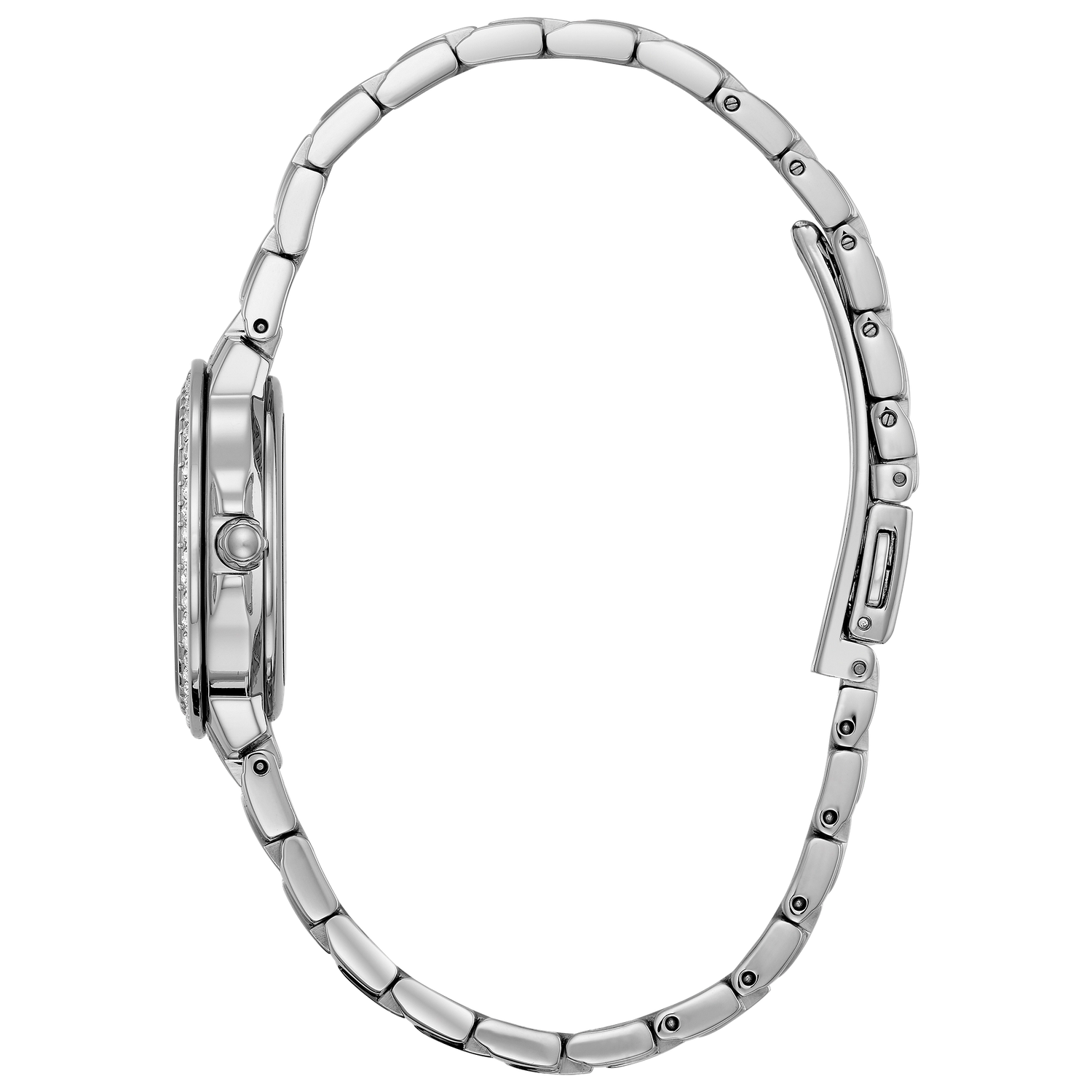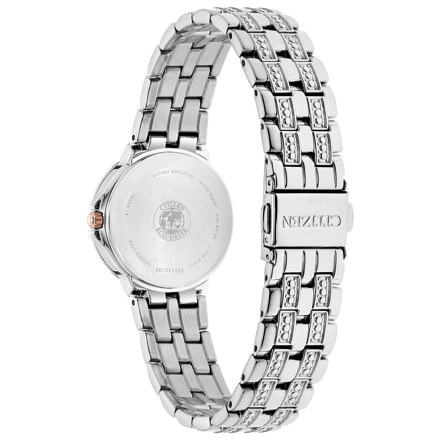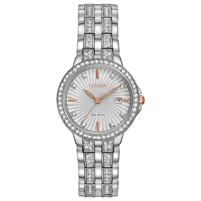 Un reloj elegante y brillante, diseñado con líneas clásicas y un toque de moda. Este modelo destaca por sus 126 cristales distribuidos entre bisel, caja, carátula y brazalete, ofreciendo un estilo sofisticado y femenino. Funciona con tecnología Eco-Drive, alimentado por cualquier fuente de luz.