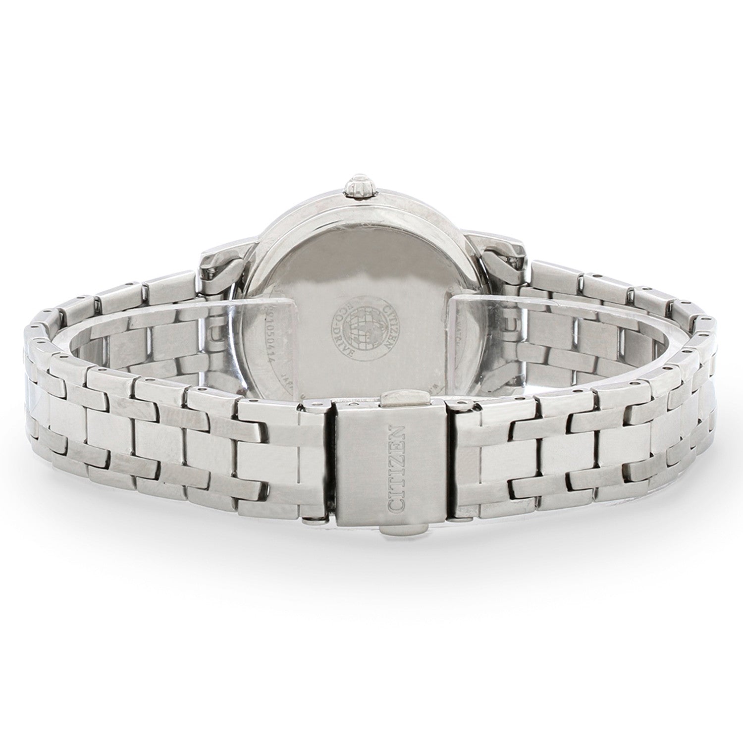 Reloj Citizen Silhouette para mujer con diseño elegante y femenino, destacando su carátula madre perla y brazalete de acero inoxidable. Ofrece funcionalidad diaria con fechador y movimiento de cuarzo confiable.