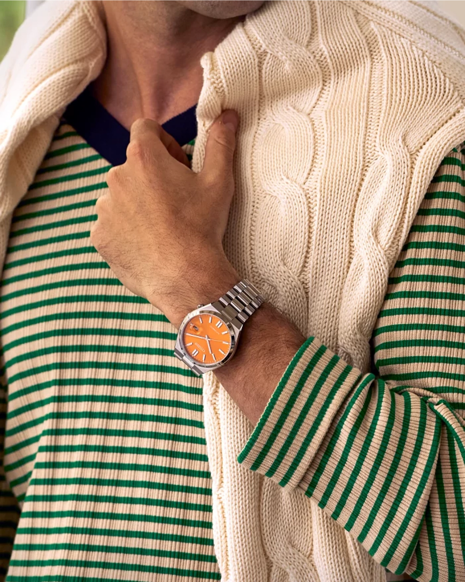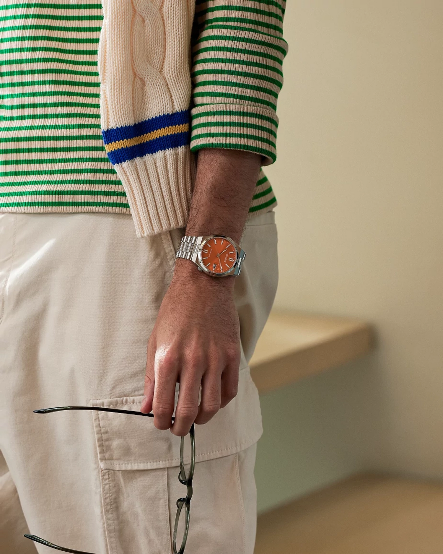 Reloj Citizen Tsuyosa automático para hombre con caja de acero inoxidable plateado de 40 mm, pulsera de acero integrada y esfera naranja con patrón de rayos de sol.