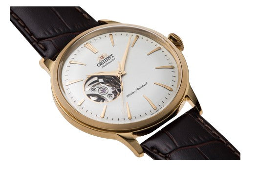 - Este nuevo reloj mecánico ORIENT de 40,5 mm, que ofrece una sorprendente fusión de estilo clásico y excelente relojería, ofrece varias características excepcionales. El cristal redondeado del reloj enmarca elegantemente la esfera plateada curvada tipo bomba, colocada en una hermosa caja de acero inoxidable dorada. Para realzar la estética seductora, se encuentra una elegante parte posterior transparente de la caja. Otras características notables incluyen una vista semi esquelética, una atractiva correa para todas las ocasiones, atractivas manecillas doradas y una corona de cuerda manual con funcionalidad de cuerda automática. El refinado RA-AG00003S admite una resistencia al agua de 30 metros.