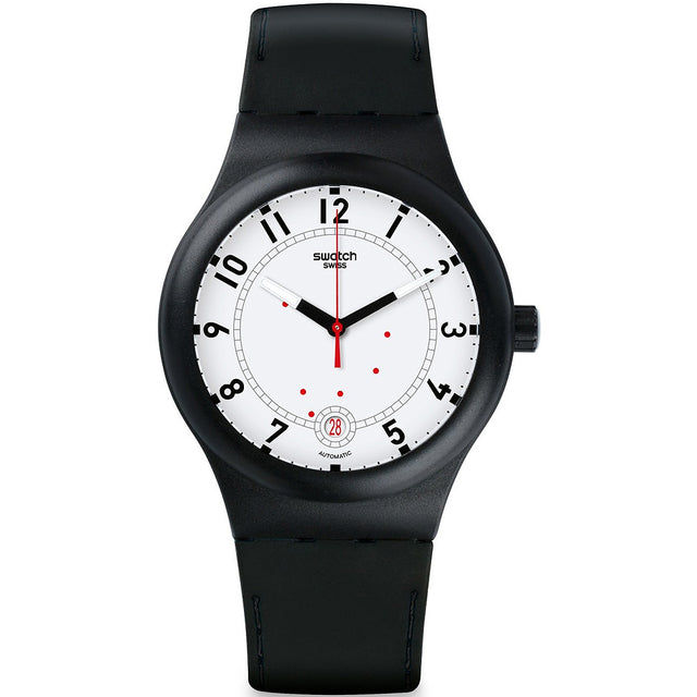 Reloj automático Swatch Sistem51 con diseño minimalista en negro y blanco, movimiento mecánico totalmente automatizado y ventana de fecha. Su estilo limpio y moderno es ideal para uso diario con un toque técnico y sofisticado.
