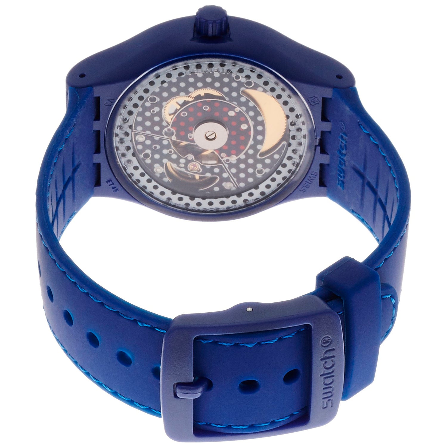 Reloj Swatch Sistem51 automático con diseño moderno en azul mate, carátula blanca y ventana de fecha a las 6. Su fondo transparente revela un patrón gráfico distintivo del movimiento, resaltando su ingeniería minimalista y estética única.