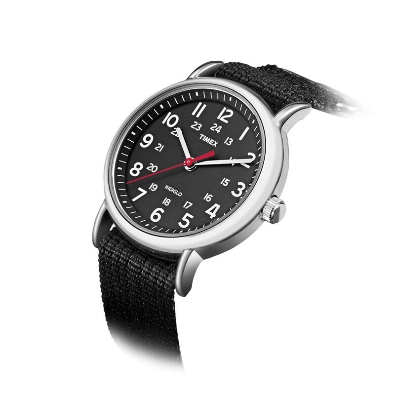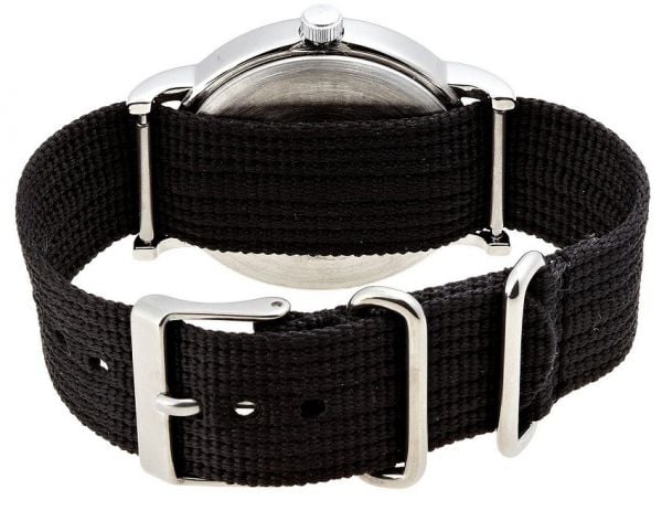 - Descripción: Reloj unisex Weekender con caja de latón plateada pulida de 38 mm, correa de tela negra slip-thru intercambiable y esfera negra con números arábigos completos. Incluye tecnología Indiglo®.