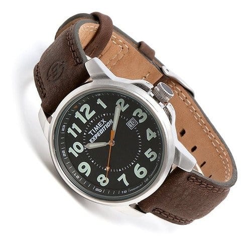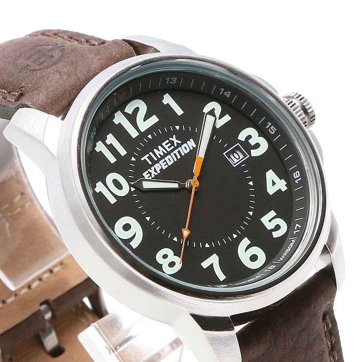 - Descripción: Reloj Timex Expedition Field de 40 mm con caja plateada cepillada, esfera negra y correa de cuero marrón con acabado mate.