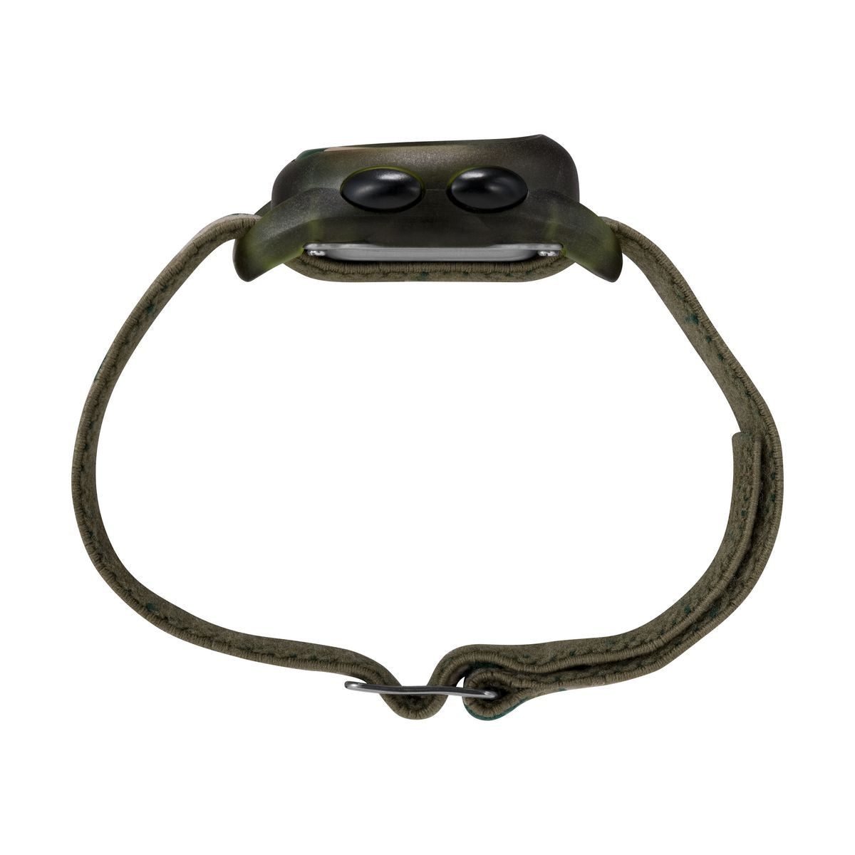 - Descripción: Reloj digital juvenil con caja de resina verde translúcida de 34 mm, correa de tela elástica verde camuflaje de tipo slip-thru y pantalla digital. Incluye tecnología Indiglo®.