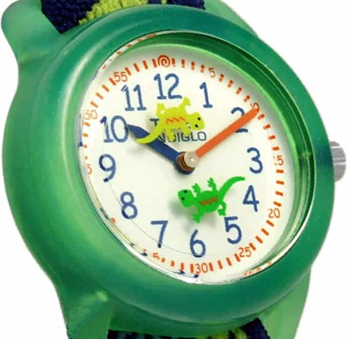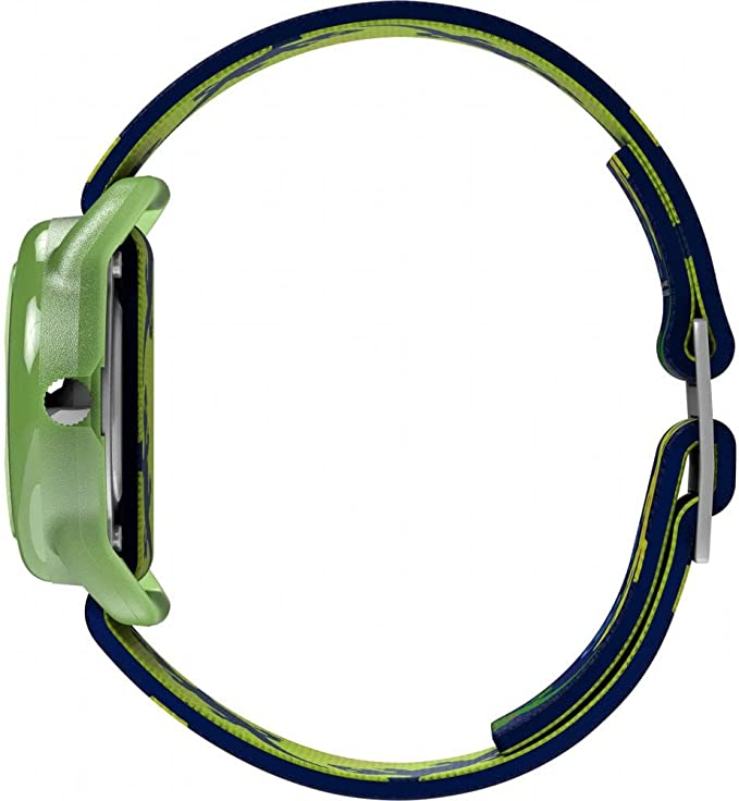 - Descripción: Reloj analógico juvenil con caja de resina verde translúcida de 29 mm, correa de tela elástica azul de tipo slip-thru y esfera blanca con marcadores arábigos completos.