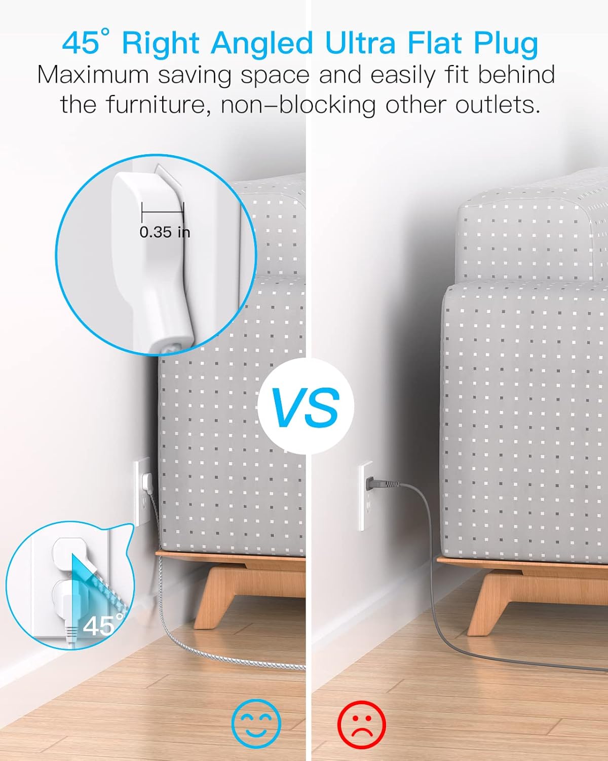 - Enchufe ultra plano en ángulo recto y cable de extensión trenzado de 1.5 m: el enchufe ultra delgado de sólo 0.9 cm y un diseño de 45 grados de ángulo recto, se puede colocar fácilmente en la pared y ocultar en la parte posterior de los muebles, sin desperdiciar espacio ni enchufes. El cable de extensión de 3 mm de grosor está hecho de cobre puro, lo que le confiere una mayor capacidad de transporte de corriente (15 A). El cable de alimentación trenzado no se deforma fácilmente, es duradero y más seguro.