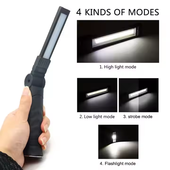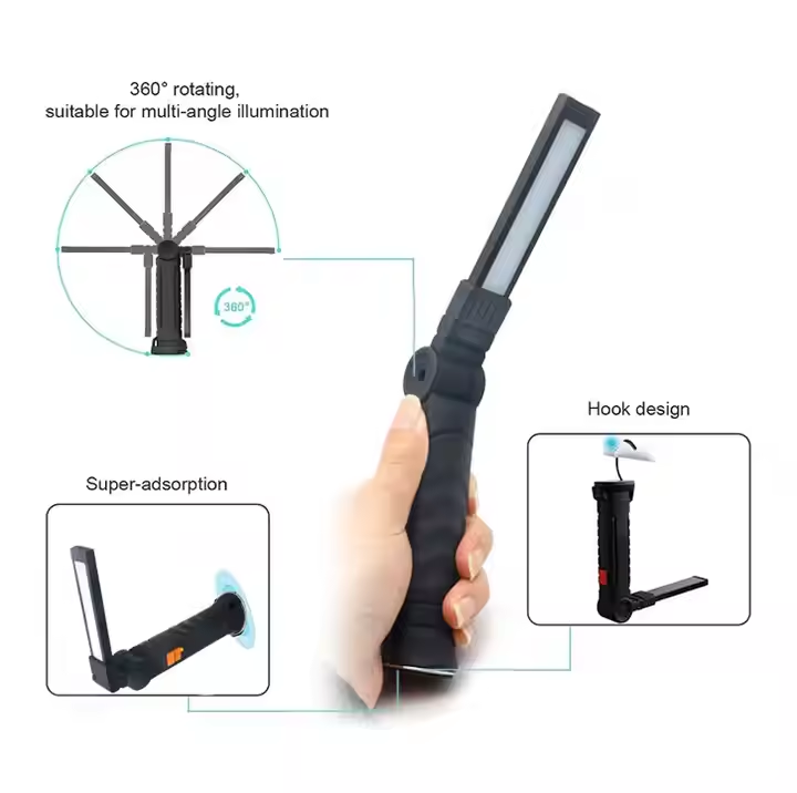 Linterna de trabajo versátil equipada con una potente barra COB y una luz LED adicional. Su diseño plegable permite ajustarla según las necesidades del entorno. Cuenta con base magnética para fijación en superficies metálicas y rotación de 360° para iluminar en cualquier dirección. Ideal para actividades al aire libre, reparaciones, camping y emergencias.