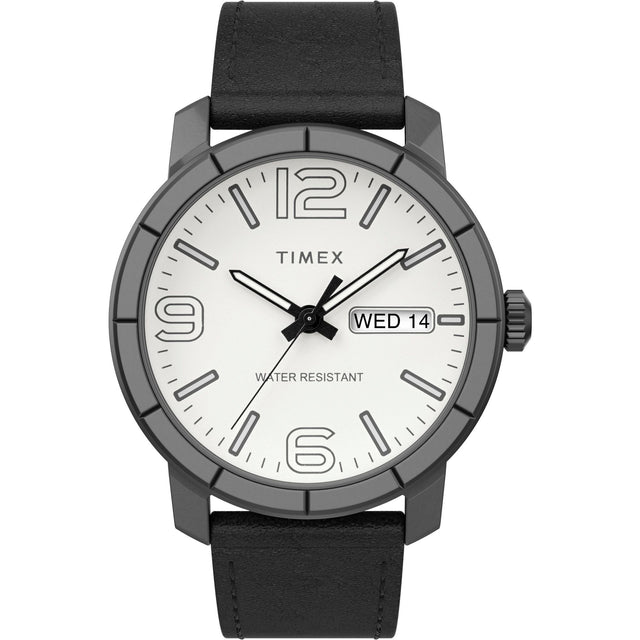 - Descripción: Reloj Mod con caja plateada antigua mate de 44mm, correa de cuero negra y esfera blanca con marcadores arábigos y numéricos parciales.