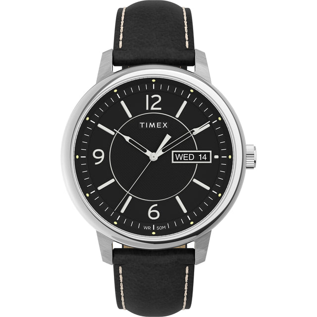 - Descripción: Reloj Chicago con función de día y fecha, caja plateada cepillada/pulida de 45mm, correa de cuero negra de dos piezas con liberación rápida y esfera negra con números arábigos parciales.