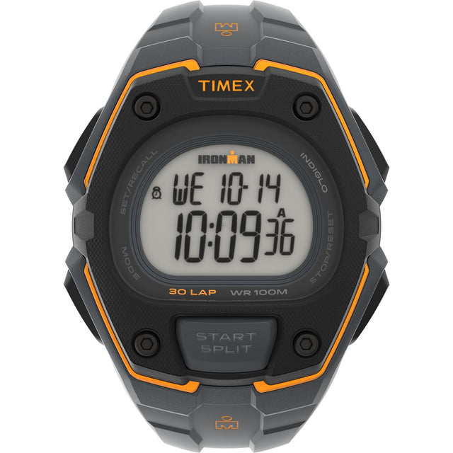 - Descripción: Reloj digital TIMEX IRONMAN Classic 30 Oversized con caja de resina gris, detalles en naranja y correa gris, ideal para deportistas y uso intensivo.