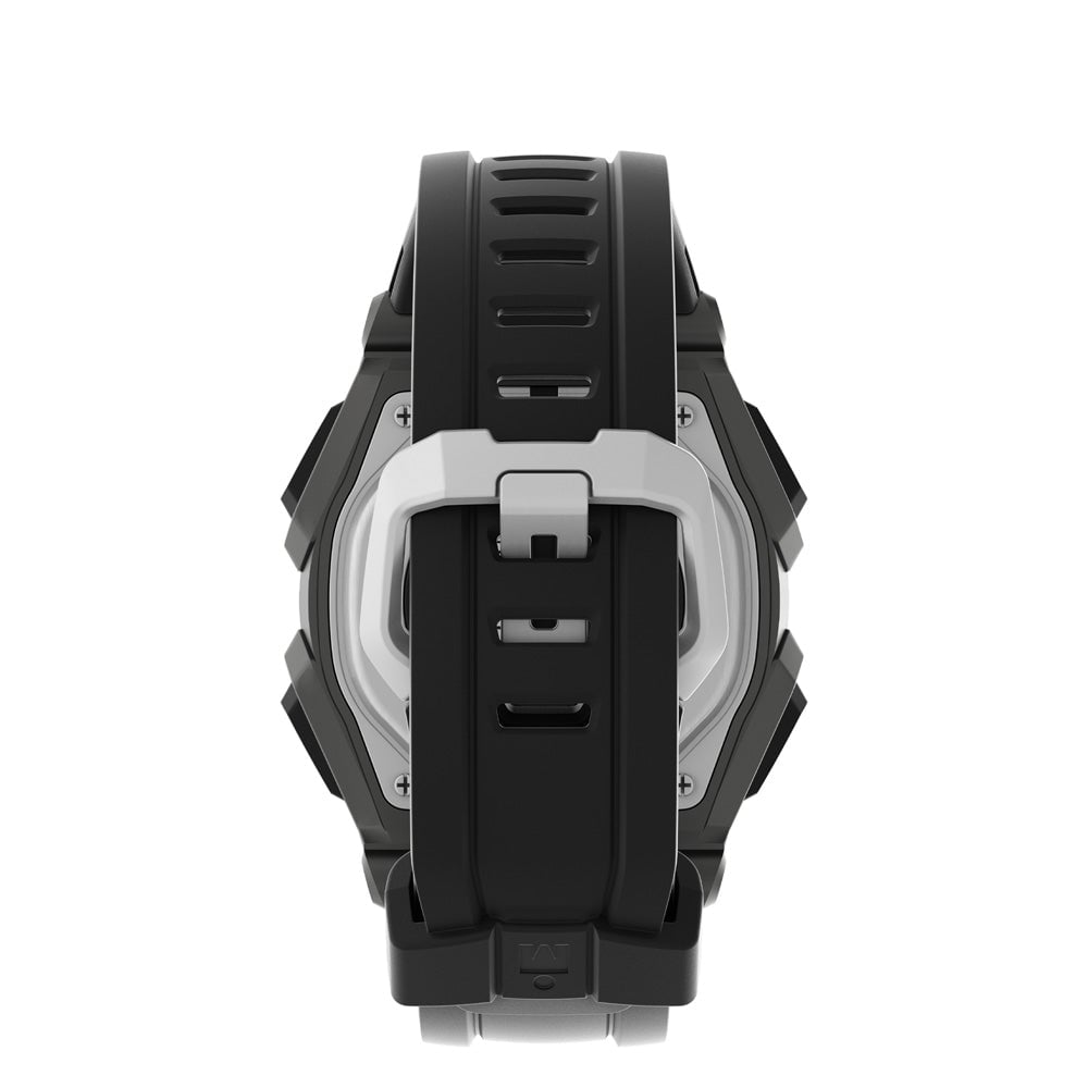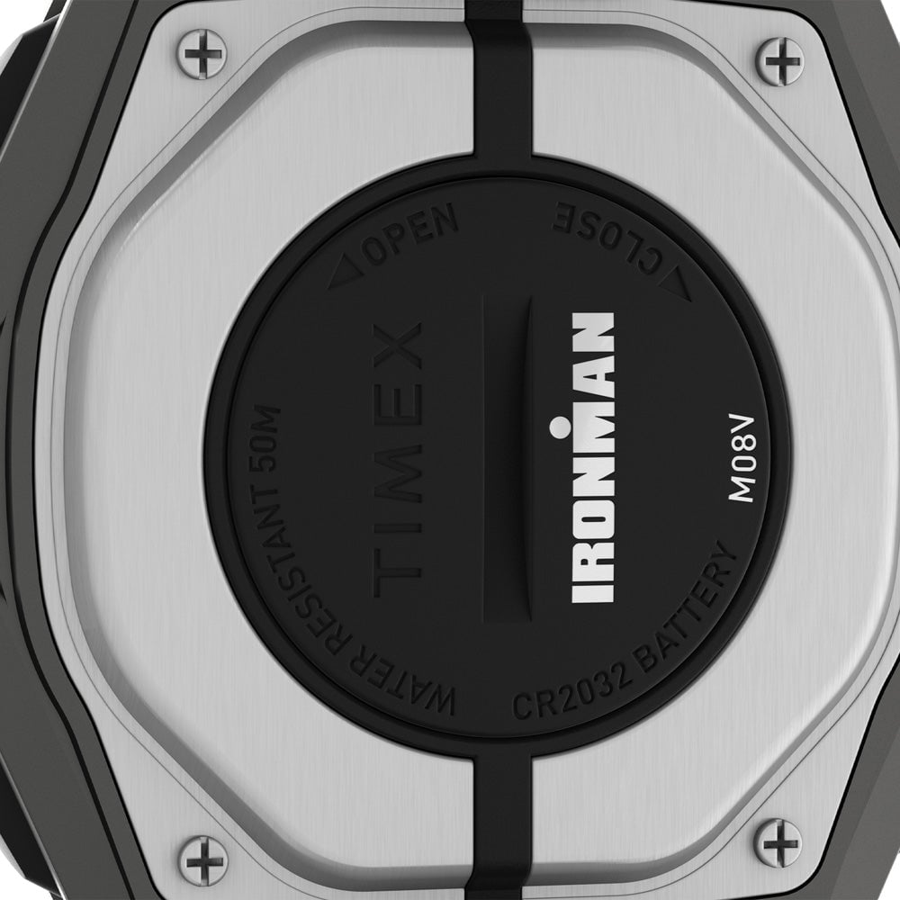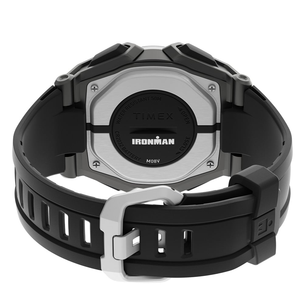 - Descripción: Reloj digital TIMEX IRONMAN Classic 10+ con monitor de actividad y frecuencia cardíaca, caja de resina gris con aro superior negro y acentos naranjas, correa de resina negra y diseño robusto de 43 mm.