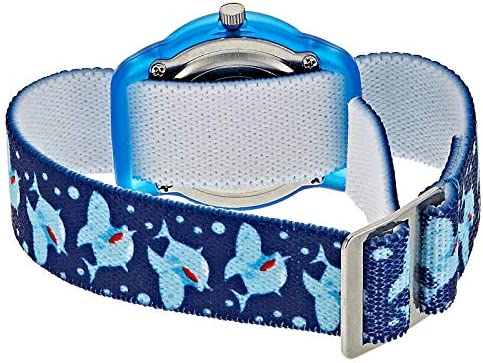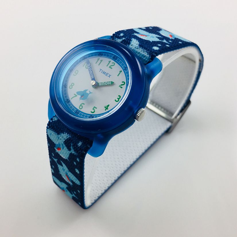 - Descripción: Reloj juvenil Timex Time Machines con caja de resina azul translúcida de 29 mm, esfera blanca y correa elástica azul con estampado de tiburones. Diseño divertido y cómodo, ideal para niños.