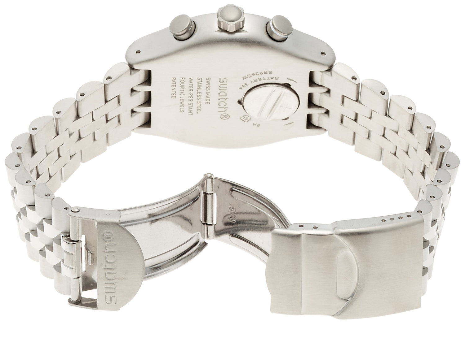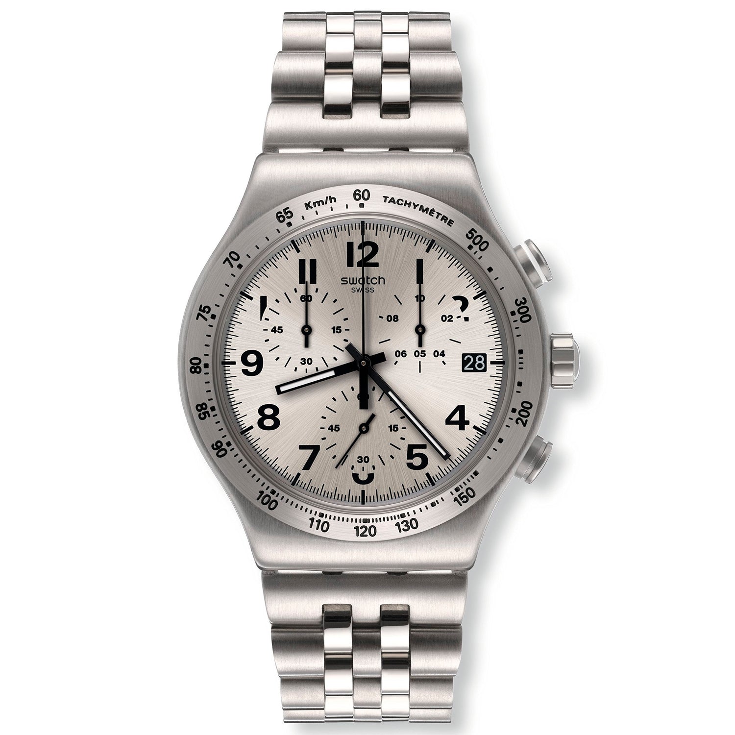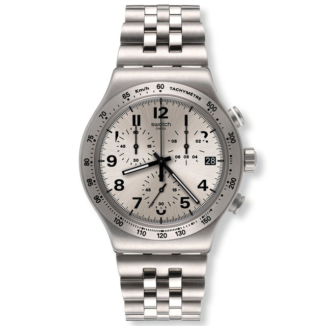 Cronógrafo Swatch de estética metálica plateada, con carátula plateada y brazalete de acero inoxidable. Su diseño combina funcionalidad y estilo urbano, ideal para uso diario.